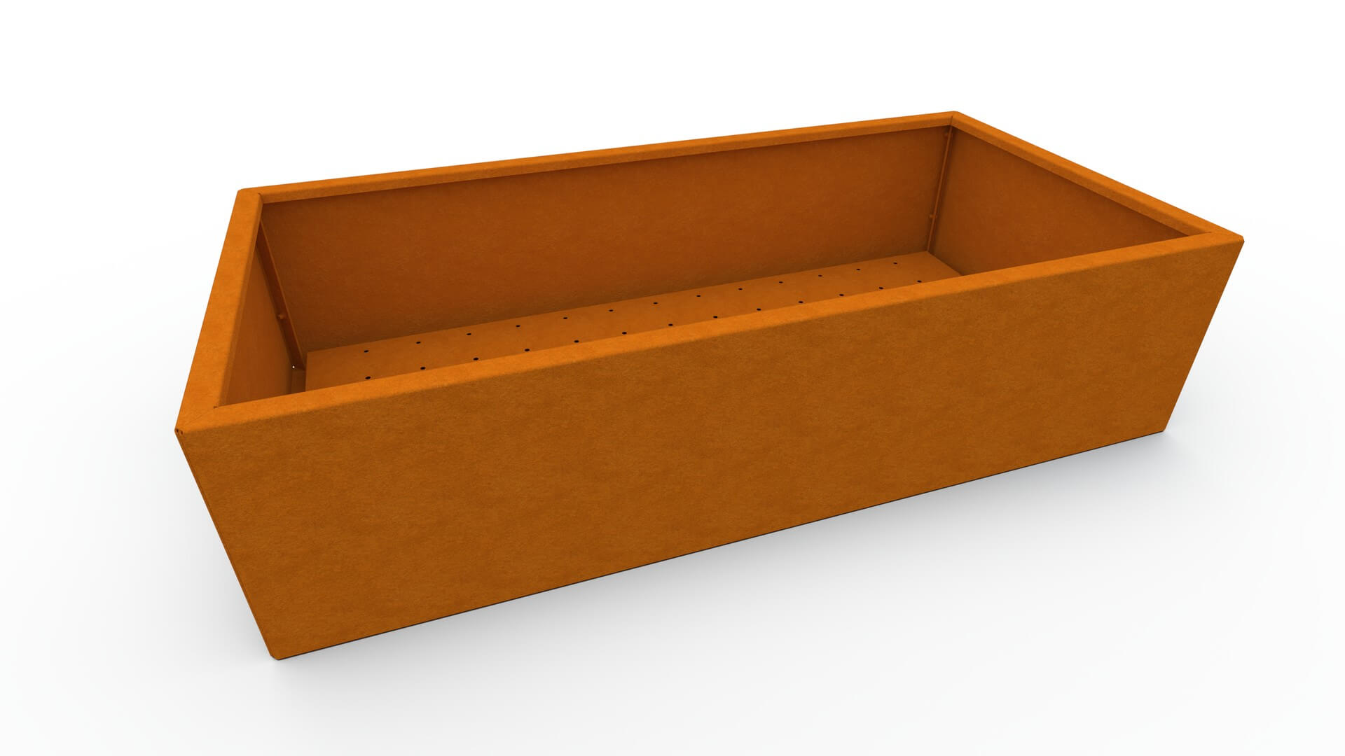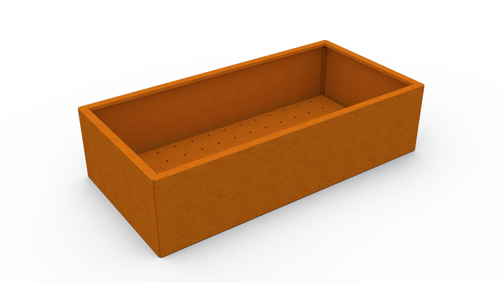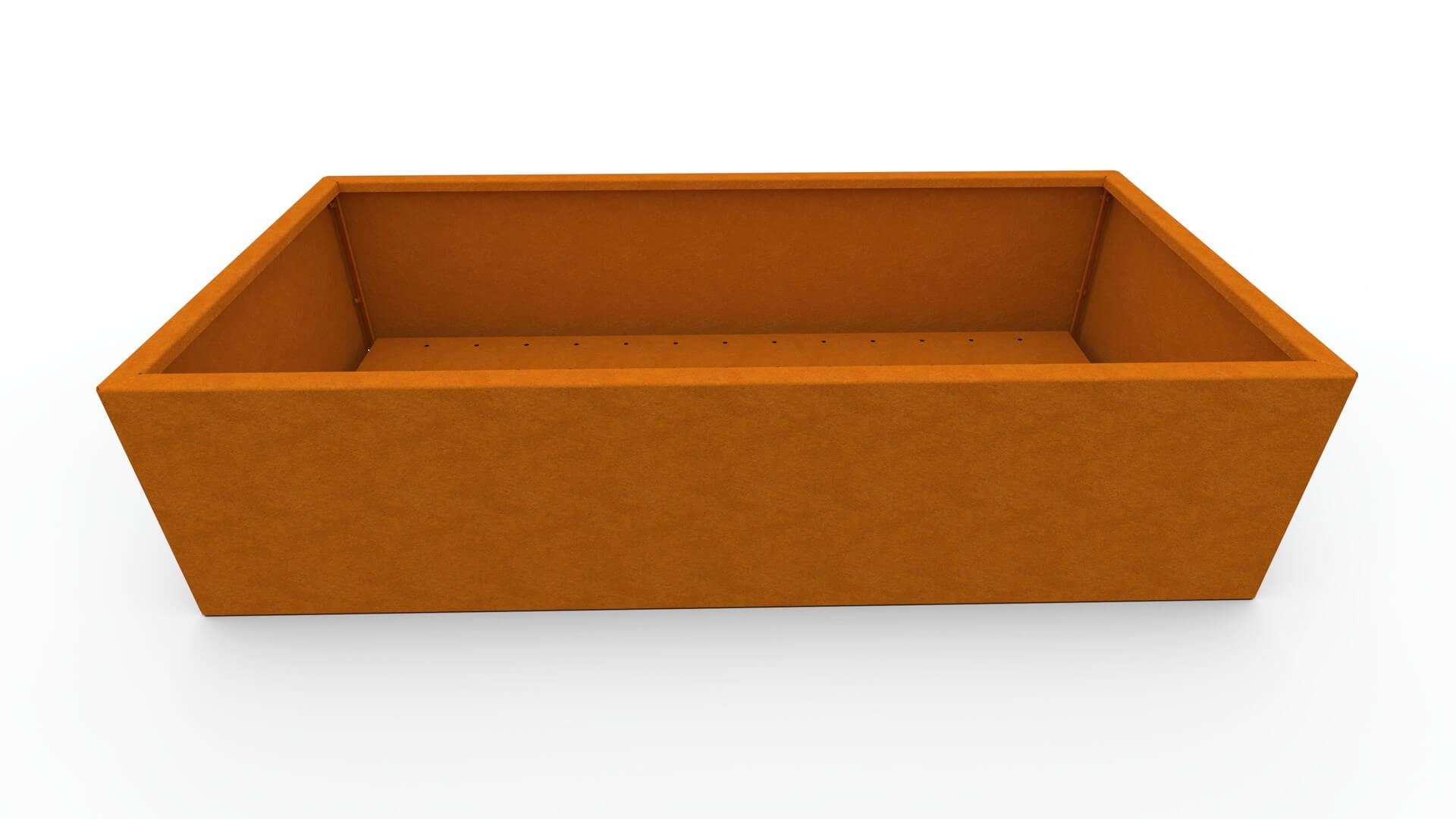 Cvetlično korito je izdelano iz visokokakovostnega 1,5 mm debelega corten jekla, znanega po izjemni odpornosti in dolgi življenjski dobi. Corten sčasoma razvije naravno rjavkasto patino, ki mu daje prepoznaven, moderen videz. Patina nastaja postopoma in omogoča, da je korito obstojno v vseh vremenskih razmerah, brez potrebe po barvanju ali dodatnem vzdrževanju.